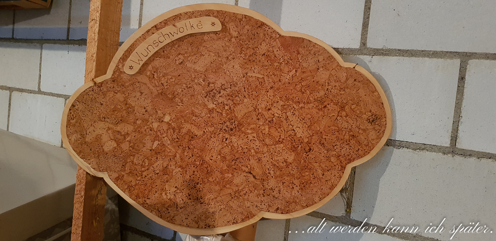 So sah unsere Wunschwolke ursprünglich aus. Wir hatten aus Laubsägeholz eine Wolke ausgesägt und eine etwas kleinere Wolke aus Kork aufgeklebt.