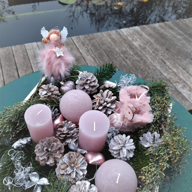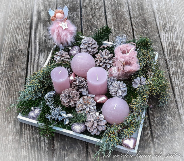 Meine Adventskränze sind dieses Jahr viereckig. Meine Jüngste bekommt eine rosa Variante. Kitsch? Klar, den zelebrieren wir im Advent.