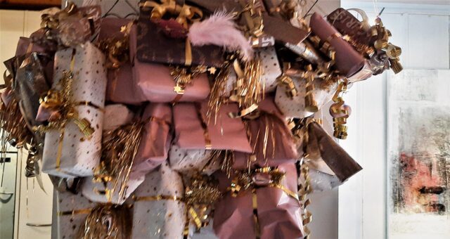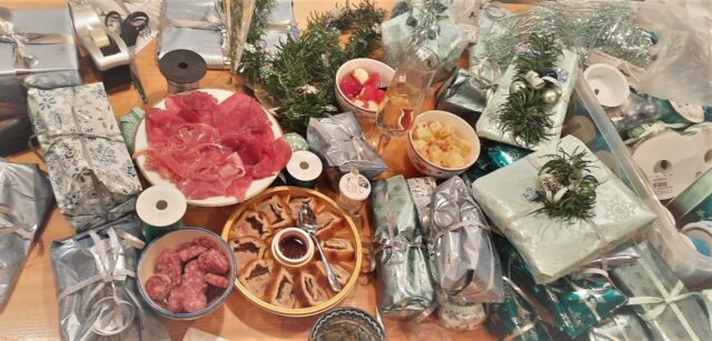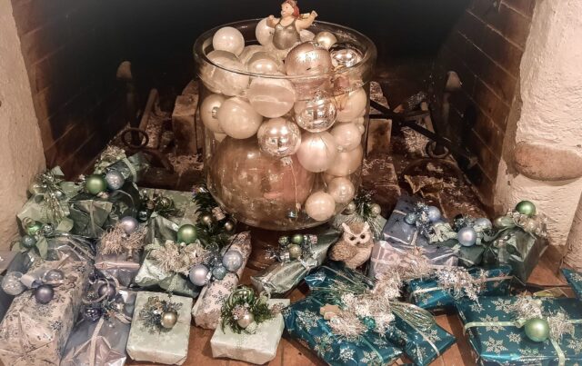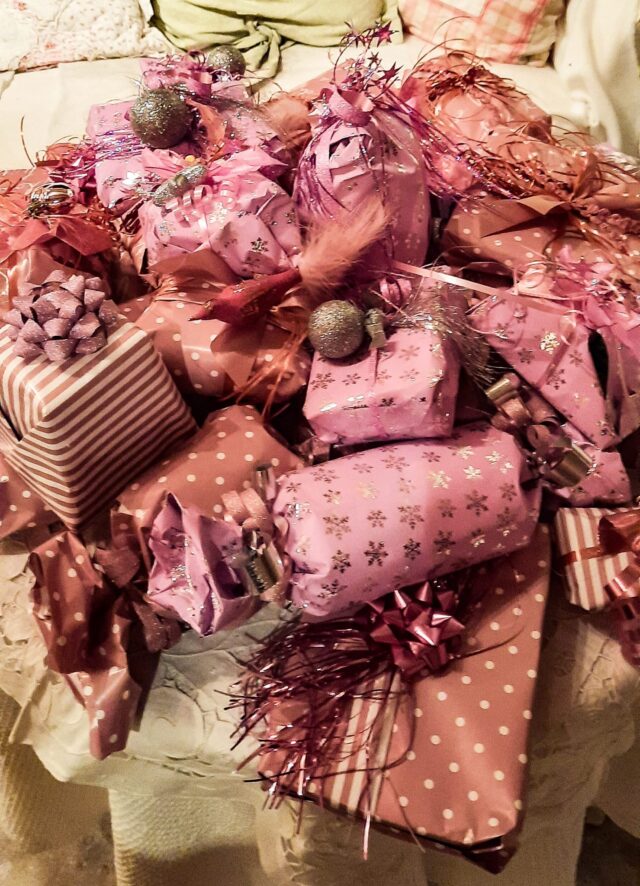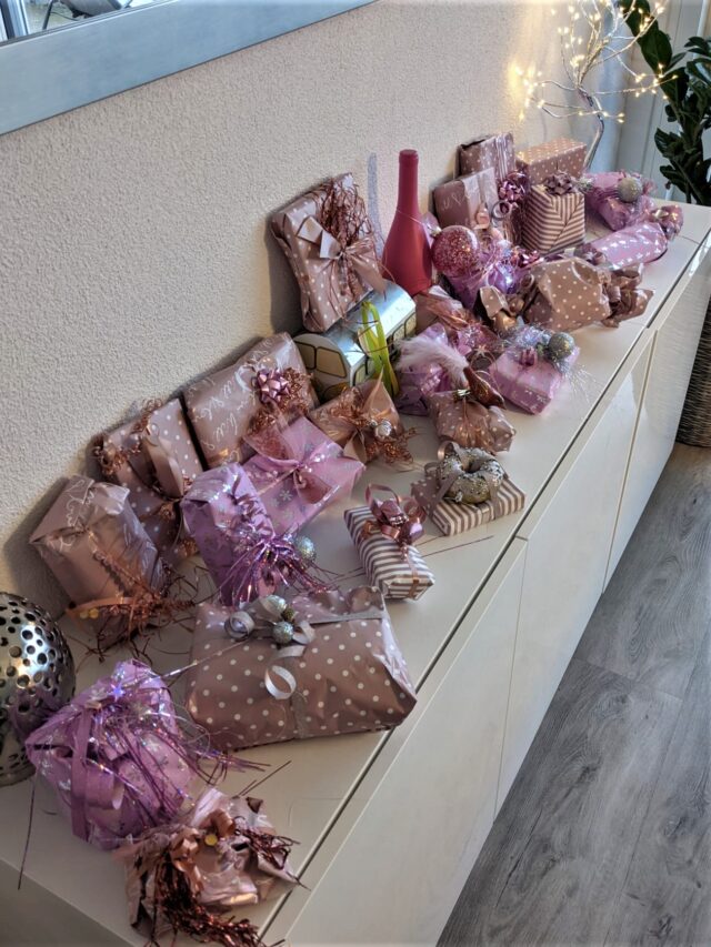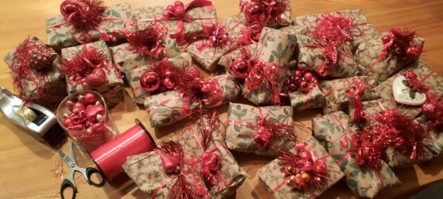 Meine Töchter machen beide je 12 Päckli. Mit der Farbgebung hatten sie sich nicht abgesprochen – und es wurde eine wunderbar harmonische Kombination, die mit meinem Lieblingsbild im Hintergrund korreliert.