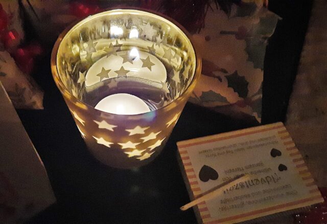 …und einer Schachtel Zündhölzer. Fränzi hat sie mit Papier bezogen und ein Schild darauf geklebt, das sie am Computer selbst beschriftet hat – und ich weiss nun, was ich zu tun habe: Jeden Tag eine Kerze anzünden und staunen, was durch das flüssige Wachs durchschimmert, wenn das Teelicht fast abgebrannt ist.