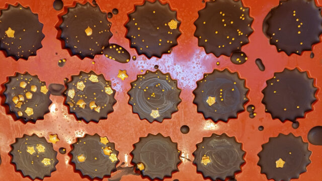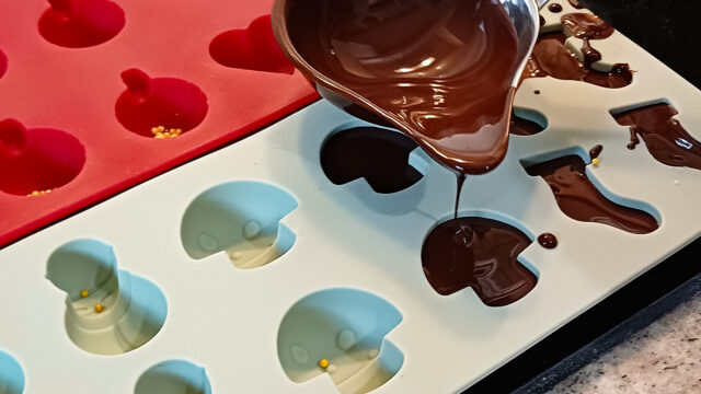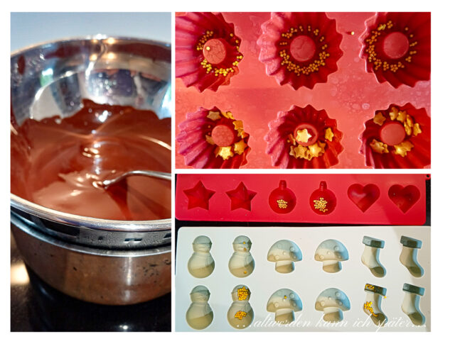 Die flüssige Kuvertüre geben wir in die Silikonförmchen, in die wir bereits Deko-Zuckersterne und -perlen gelegt haben.