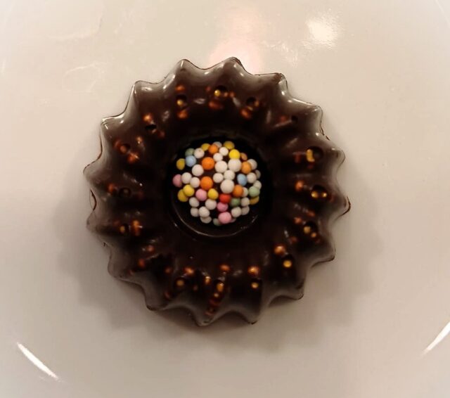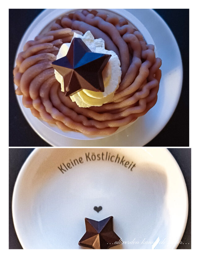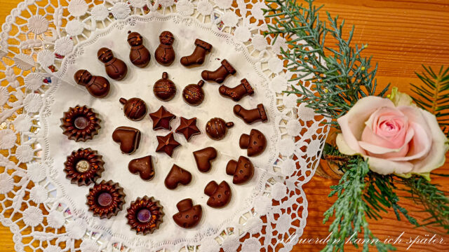 Die kleinen Formen werden zu Kaffee oder heisser Schokolade serviert. Dieses Konfekt habe ich mit Schokolade statt mit Kuvertüre hergestellt, deshalb glänzen sie nicht.