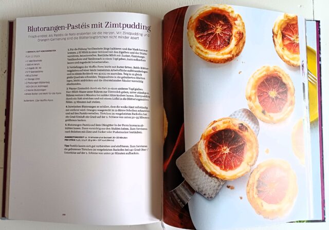 Ich liebe Pastéis de Nata (bei uns Nideltörtli) über alles. In diesem Buch fand ich ein Rezept mit Blutorangen und Zimt.
