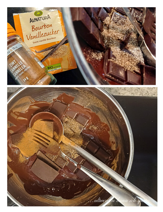 Wir schmelzen Kuvertüre und rühren Vanillezucker und Zimt darunter. Unbedingt Kuvertüre verwenden. Normale Schokolade wird “grau” oder fleckig. Kuvertüre enthält mehr Kakaobutter und bleibt glänzend.