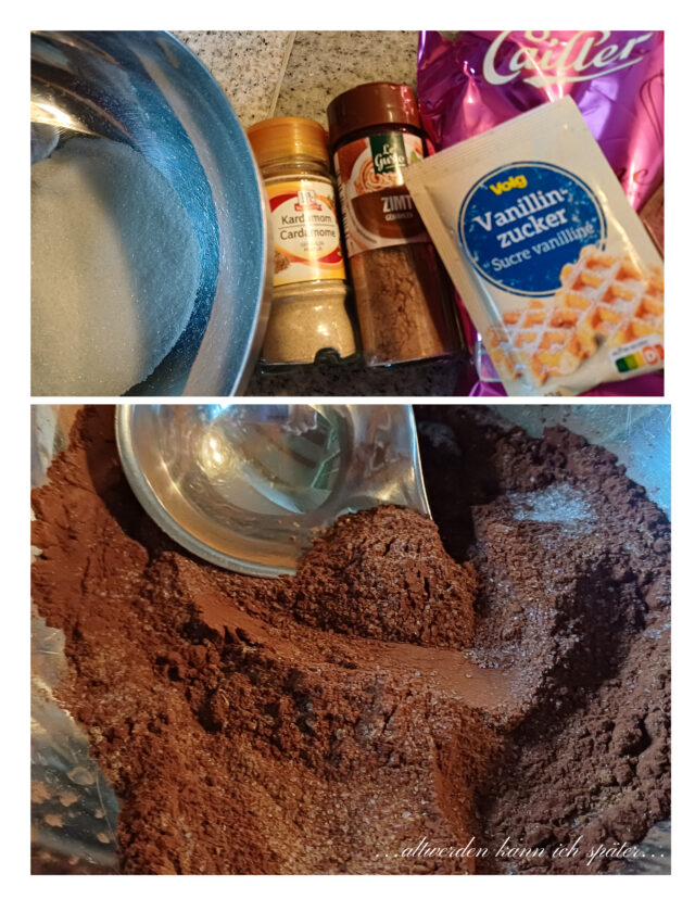 Ich mische Schokoladepulver, Puderzucker, Zimt, Vanillezucker und etwas Kardamom und fülle die Mischung in eine Streudose.