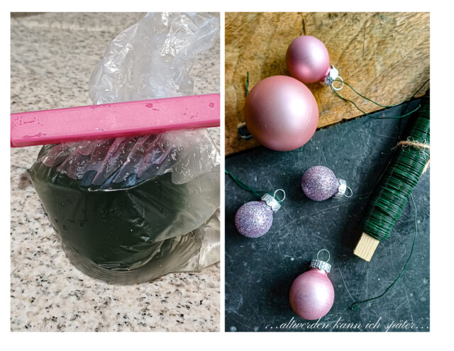 Und Blumensteckmasse brauchen wir. Diese gibt man in einen wasserdichten Plastiksack und lässt ihn über eine Nacht vollsaugen.