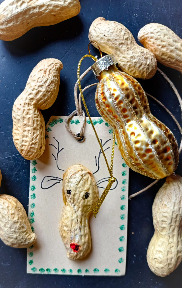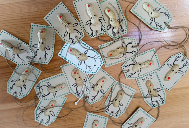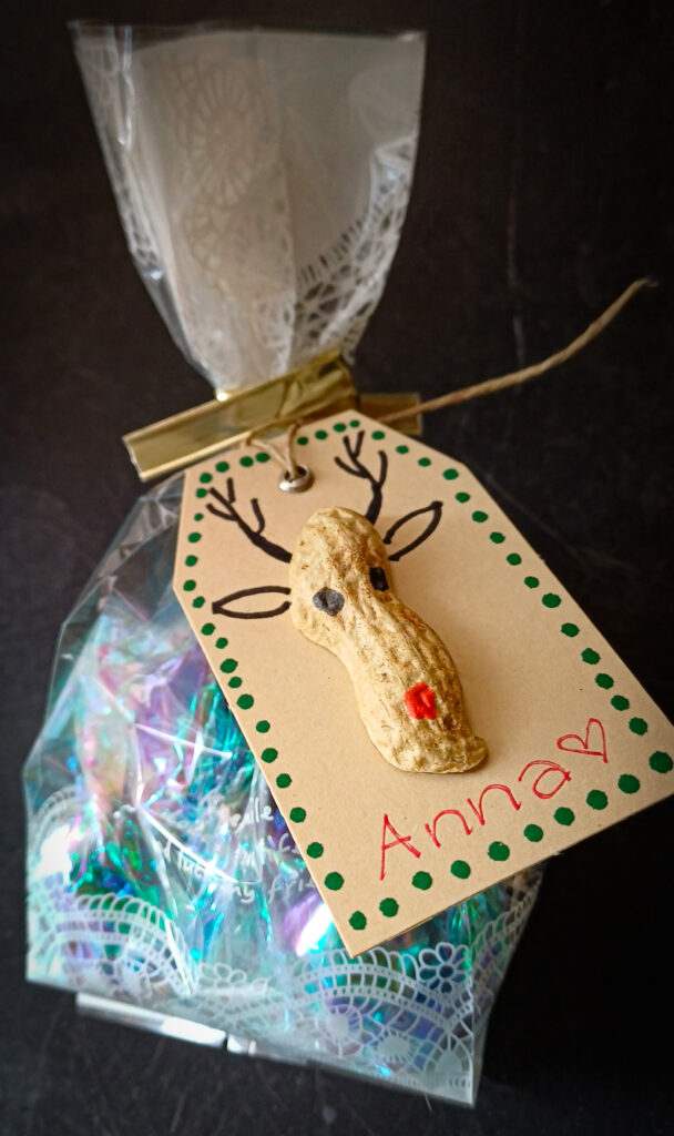 Wir schälten vor dem Cheminée Erdnüsse und achteten darauf, die halben Schalen nicht zu zerbrechen. Für uns wurden sie zu charaktervollen Rentierköpfen. Wir klebten sie auf Geschenkanhänger und malten Augen und eine rote Nase auf die Schalenhälfte. Seitlich setzten wir Ohren und Geweih an.