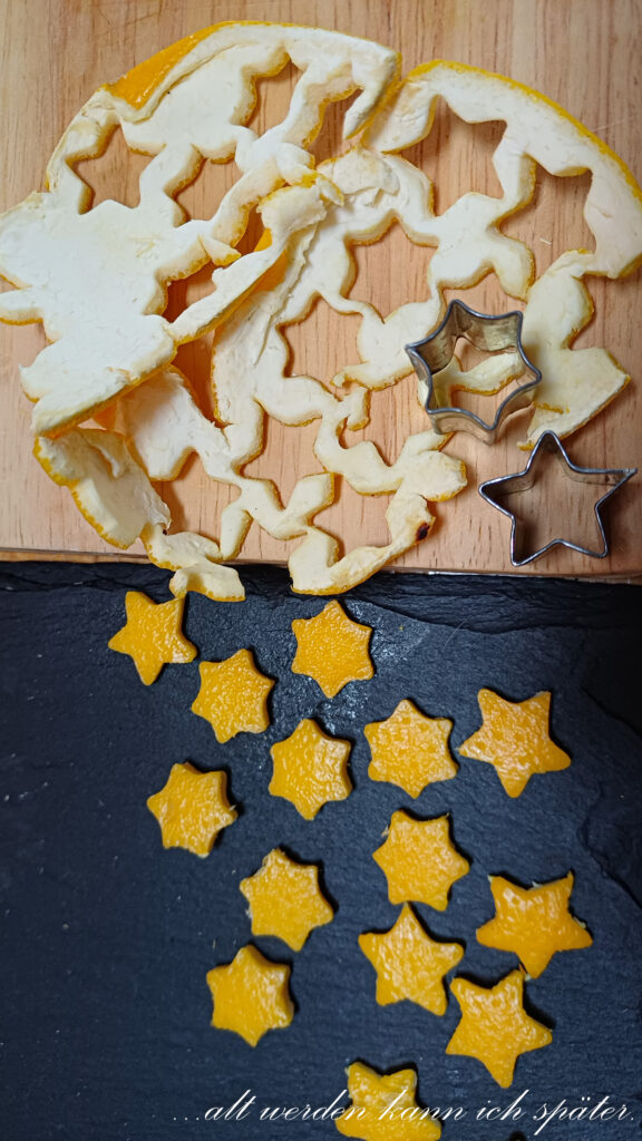 Die Sterne zum Trocknen zwischen zwei Bretter legen, sonst rollen sie sich ein.