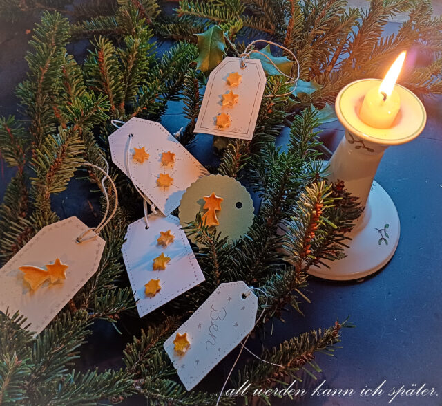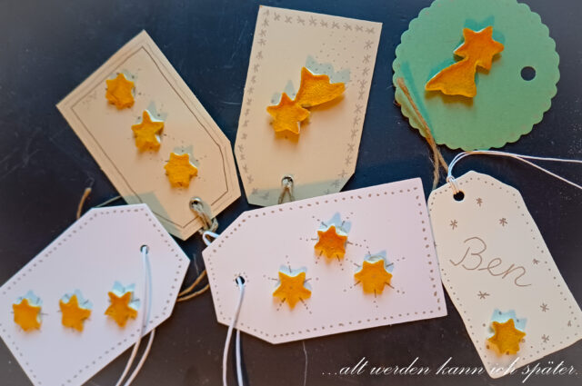 Wenn sie trocken sind, klebe ich sie auf Etiketten. Man kann sie auch auffädeln und als Girlande an einen Tannenzweig hängen.