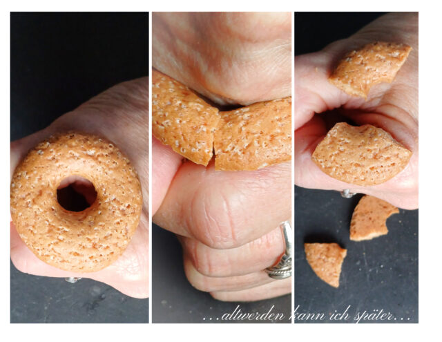 Es gibt verschiedene Variationen, wie man es geniessen soll. Eva zeigte es mir. Sie legte ein Ringli auf die linke, geballte Faust, sodass das Loch im Ringli mit dem Loch in der leicht geöffneten Faust übereinstimmte. Nun hieb sie mit der rechten Faust auf das Ringli – und es zerbarst in vier Teile.