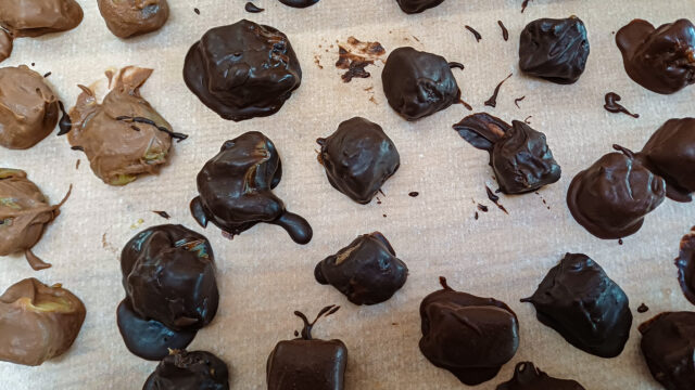 Also liessen wir uns auf das klebrige Unterfangen ein, der Masse mit einem Schokoüberzug Stabilität zu verleihen.