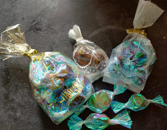 Wir verwendeten schillernde Folie zum Verpacken der einzelnen Fudges.