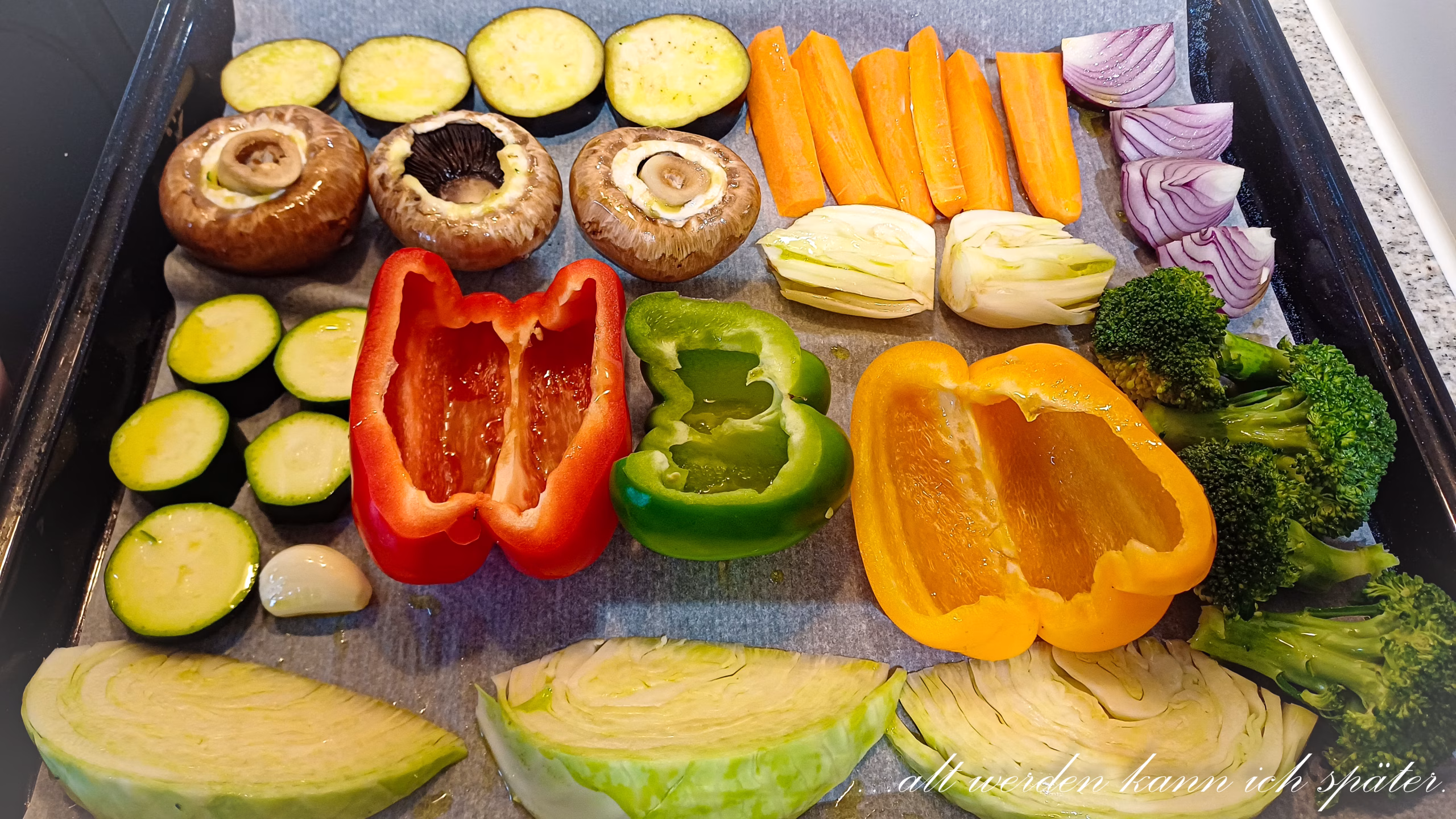 Zuerst wird Gemüse gerüstet und auf dem Backblech verteilt.