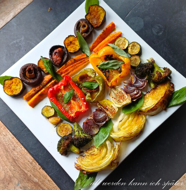 Nach dem Backen, rund 20 Minuten bei 200 Grad, richte ich das Gemüse auf einer Platte an und gebe frische Basilikumblätter dazu. Ein mediterraner Duft wabert durchs Haus.