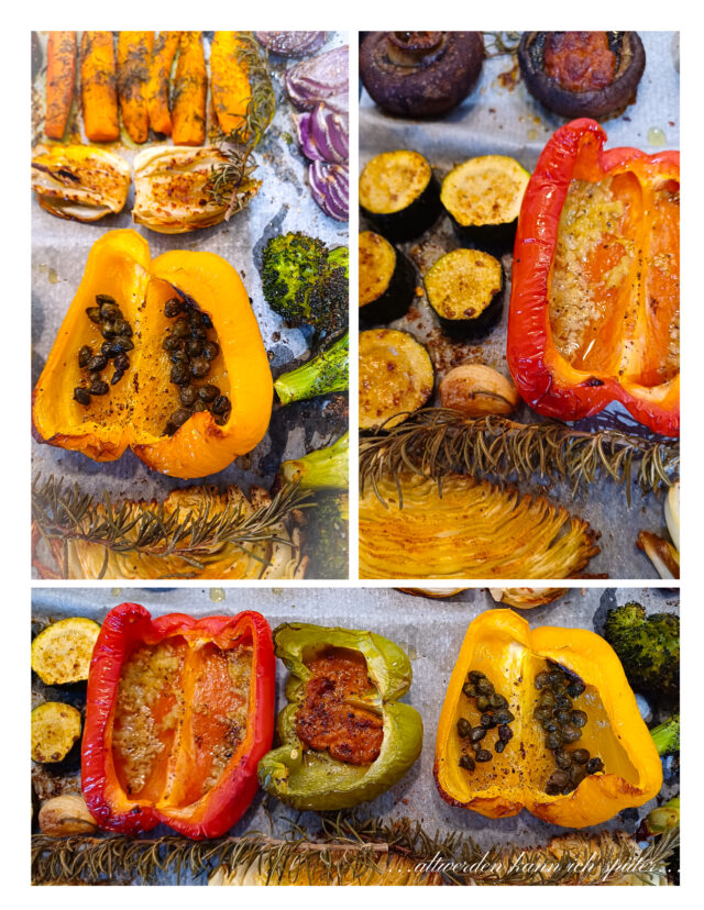Das Würzen macht Spass. Ich liebe Kapern, sie kommen in die gelbe Peperoni. In die rote gebe ich Knoblauch. Die grüne fülle ich mit selbstgemachtem Pesto Rosso. Die einzelnen Gemüse würze und salze ich individuell. Ich gebe Olivenöl darüber, am besten portioniert man es mit einer Sprühflasche.