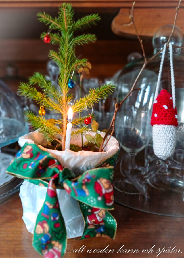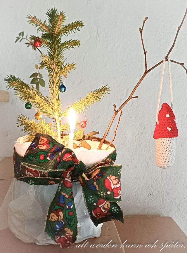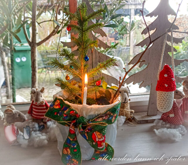 In die Erde pflanzte sie einen kleinen Tannenbaum, der in ihrem Garten gewachsen war. Er trägt klitzekleine Weihnachtskugeln. Zudem bestückte Theresa den Topf mit einer kleinen Kerze, einem Rosenzweig, einem kleinen Ast, Moos und einer kleinen Hauswurz.