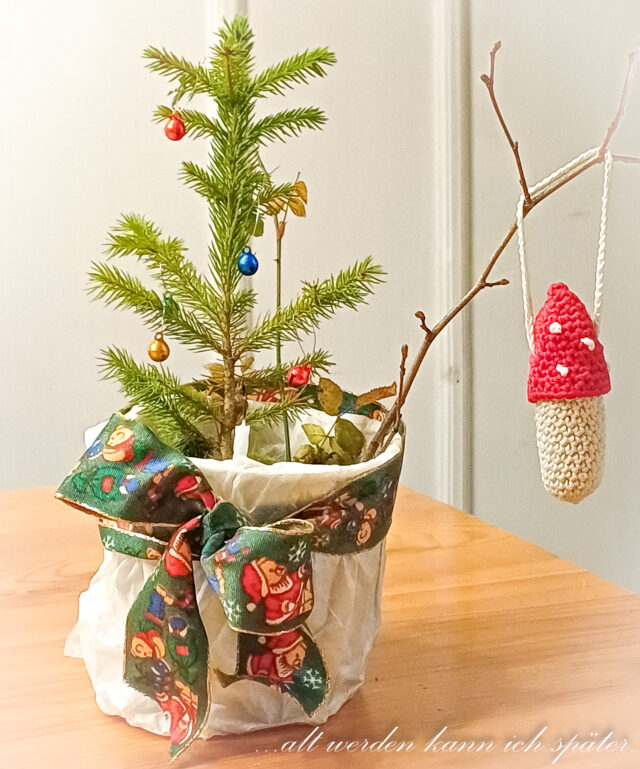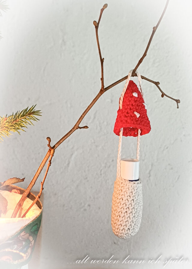Am Ast hängt ein gehäkelter Fliegenpilz.