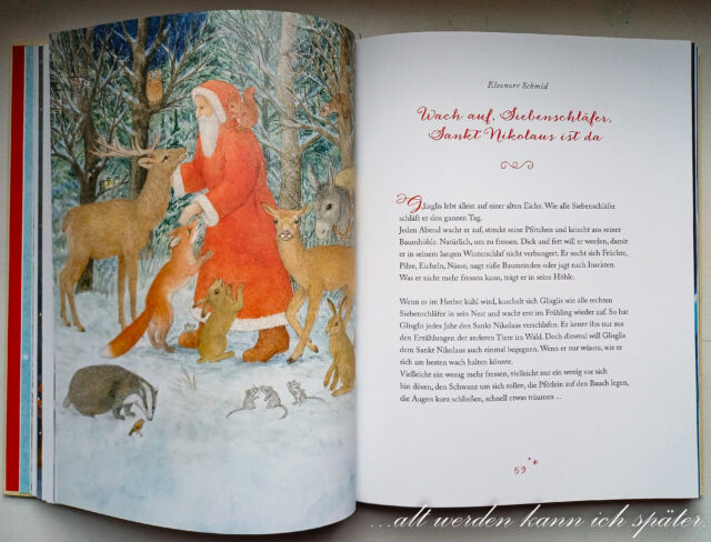 “Wach auf, kleiner Siebenschläfer, Sankt Nikolaus ist da” ist ein Weihnachtsklassiker illustriert von Eleonore Schmid. Glisglis ist ein richtiger Siebenschläfer: Im Herbst beginnt er seinen Winterschlaf und wacht erst im Frühling wieder auf. Dabei möchte er so gern einmal den Sankt Nikolaus sehen! Wenn er nur wüsste, wie er sich am besten wachhalten könnte. Er versucht alles Mögliche, aber nichts klappt. Doch dieses Jahr wird alles anders: Glisglis bewundert zum ersten Mal staunend die verschneite Welt und trifft auch endlich den Nikolaus, der allen Tieren des Waldes die wunderbarsten Leckereien mitgebracht hat.